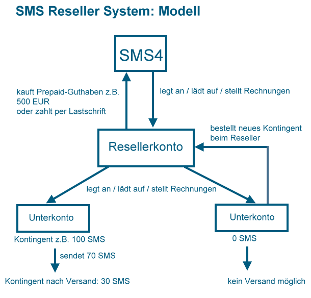 Die Rechnungsstellung an die Endkunden erfolgt durch den Reseller (z.B. Paket über Anzahl x SMS), also durch Sie selbst. Sie hingegen erhalten für die Nutzung des Zugangs bei SMS4.de die Rechnungen direkt von der alphaQuest GmbH.
